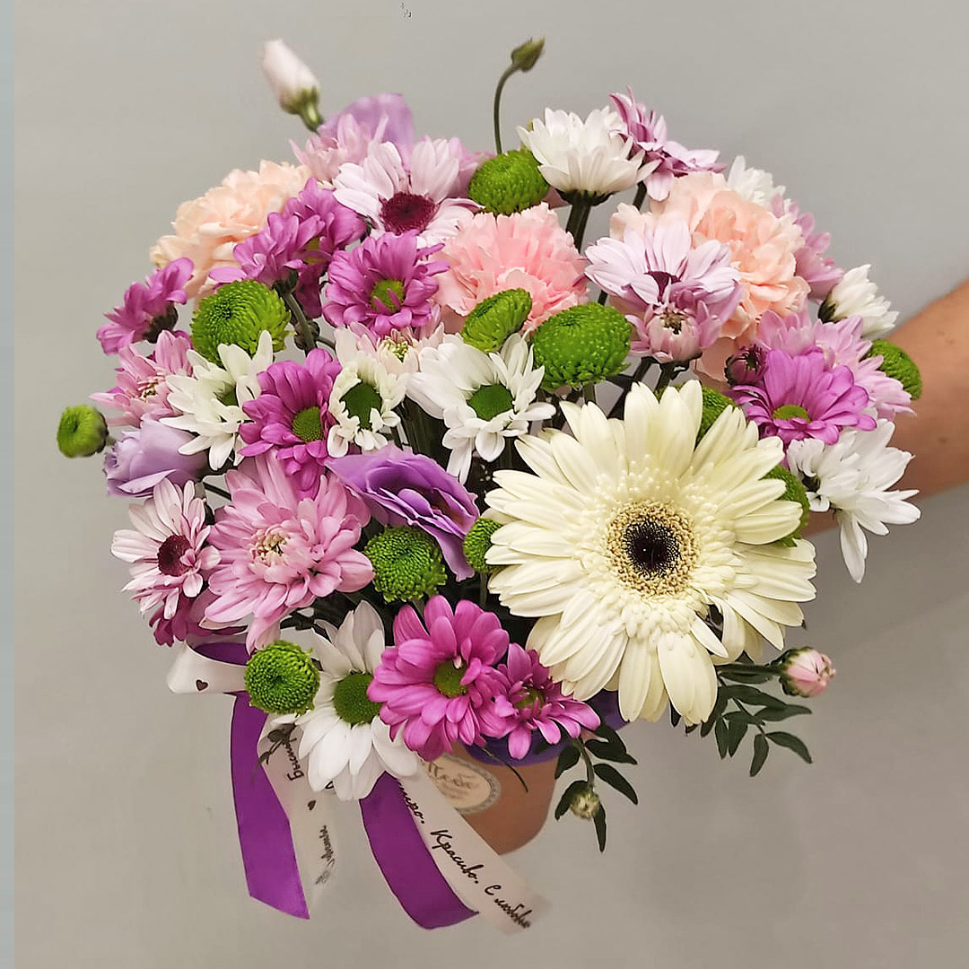 • Сумочка с цветами "Яркая" из кустовой хризантемы, роз и гербер арт. 42134