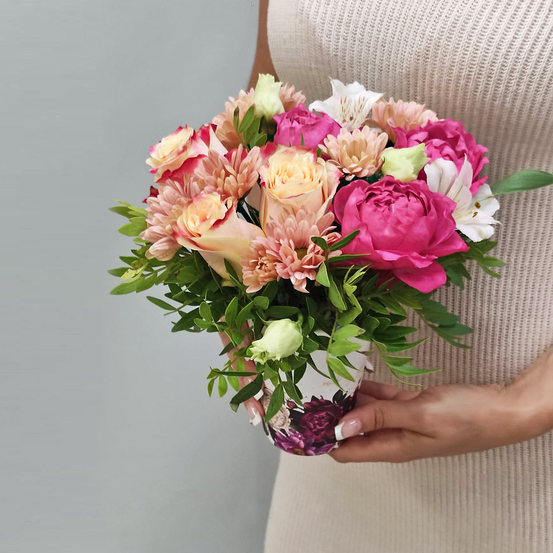 Сумка с живыми цветами "Взрыв эмоций" яркий микс из кустовой хризантемы, розы и ирисов арт. 45000