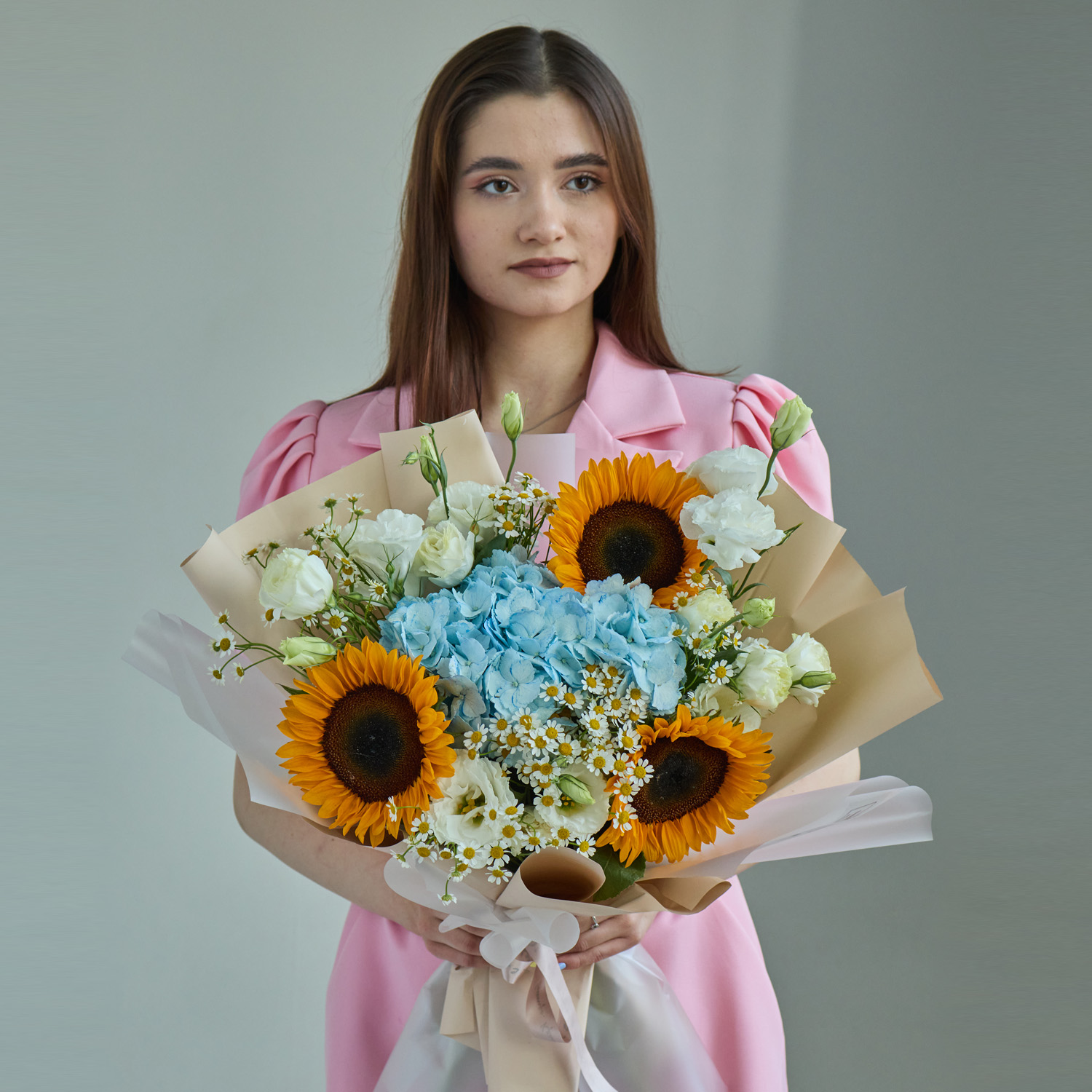 Небольшой букет с гортензией и альстромерией арт. 84571